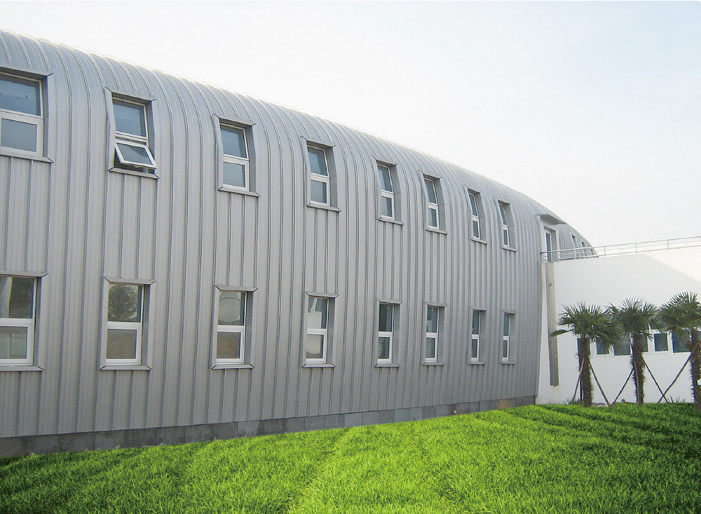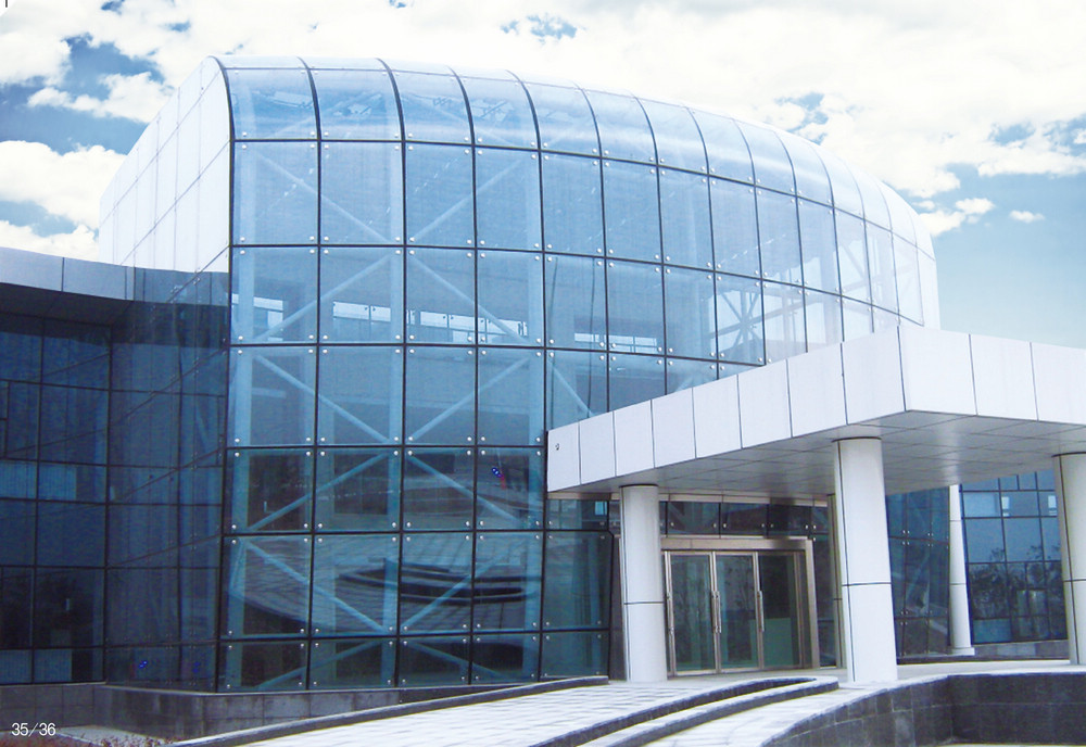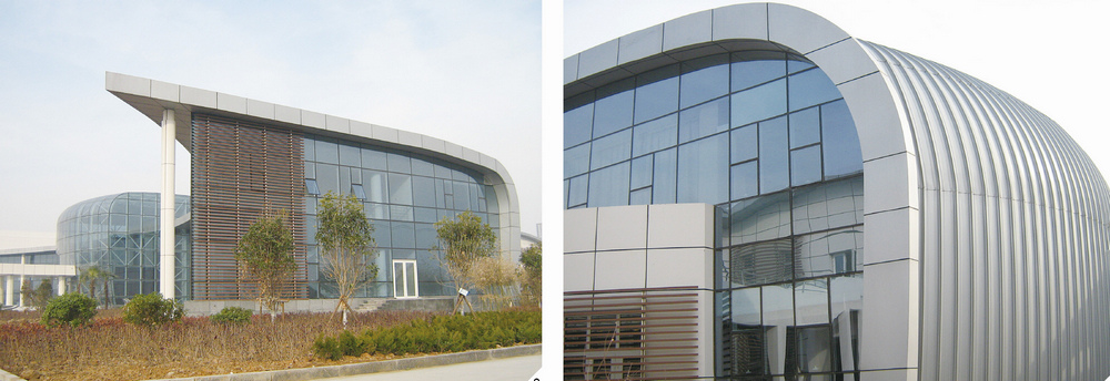 参数:GR-I型1.0mm氟碳涂层铝镁锰合金屋面板(扇弯型),隐框玻璃幕墙,点式玻璃幕墙(双曲面)。